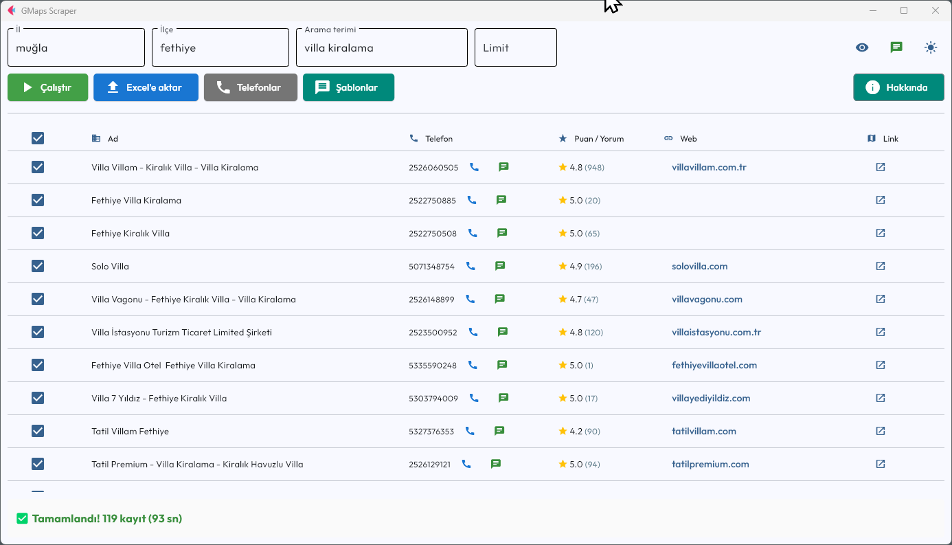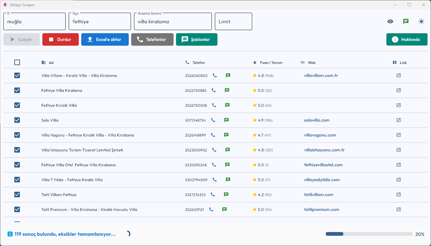 Manuel arama devri bitti. Bu yazılım, Google Haritalar üzerindeki işletme verilerini otomatik olarak tarar, sayfayı kendisi kaydırır ve saniyeler içinde yüzlerce sonucu tabloya ekler.