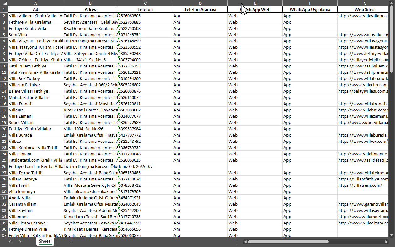 İşletme adı, adres, telefon, web sitesi, puan, yorum sayısı gibi tüm bilgiler senin elinde olur.